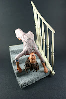 The Spider-Walk Regan was released in two different paint scheme variants, one with blood and one without. The figure I'm showcasing today, is the former. The sculpt is nice and does a good job of recreating our poor, tormented Regan. The figure has a few points of articulation, but nothing you would write to your exorcist about. Those included are: neck, elbows and upper legs. The figure really only offers one pose (unless you count a hilarious falling down the stairs pose; check out the last photo) and even then, it's a pain to get her to stay without toppling over. The only "accessory" with the figure is the staircase.