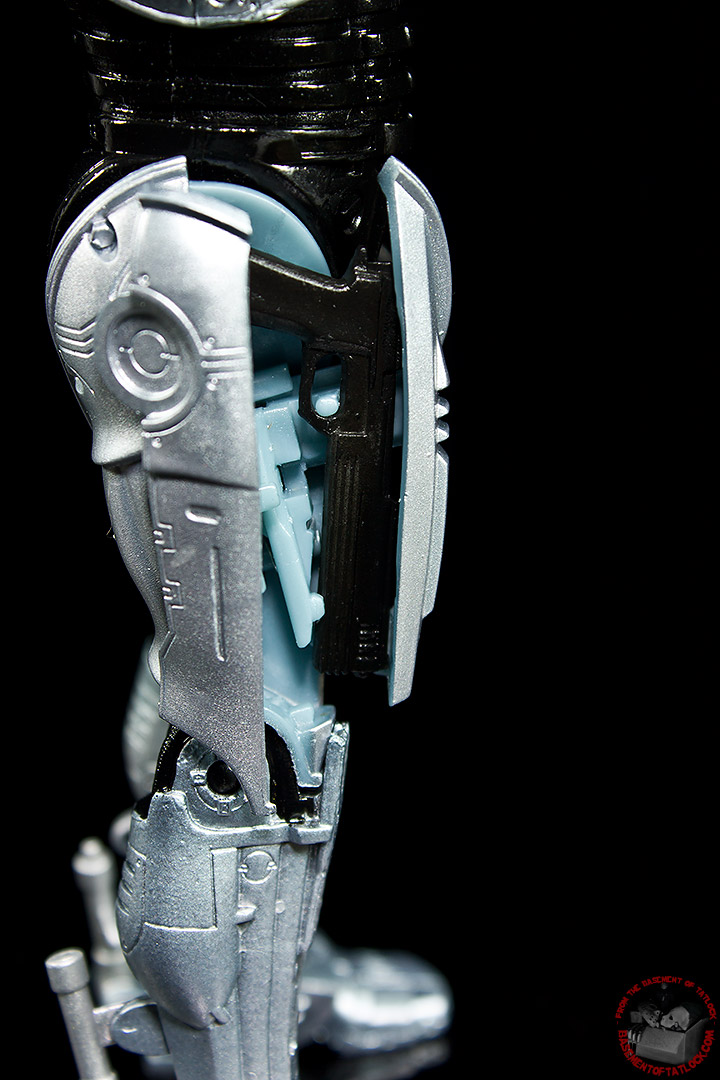 As already mentioned, RoboCop comes with a new spring loaded holster feature, which, with the press of a button on the back of his leg, shoots open and allows you to store his Auto-9 pistol. Getting the pistol in and out can be a struggle, but once secure, the leg holster snaps shut, with a satisfying click and you're good to go. Obviously the gun doesn't pop out like in the movie, but this is a 7" action figure we're talking about, so I'll let it slide. The only accessory, besides the gun, is the data spike hand, replacing his right shooting hand. Paint and sculpt are top quality, with only a little bit a slop here and there. Also, no worries about the nose poking through, unlike the original RoboCop from NECA, which had this annoying problem. Articulation is included in the head, shoulders, elbows, wrist, torso, waist, knees and ankles.